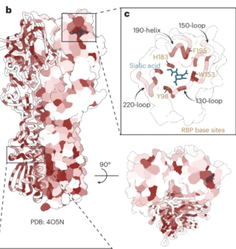 H5 influenza is considered a potential pandemic threat. Recently, H5 viruses belonging to clade 2.3.4.4b have caused large outbreaks in avian and multiple nonhuman mammalian species. […]. Here, we use pseudovirus deep mutational scanning to measure how all mutations to a 2.3.4.4b H5 HA affect each phenotype. We identify mutations that allow HA to better bind α2-6-linked sialic acids and show that some viruses already carry mutations that stabilize HA…